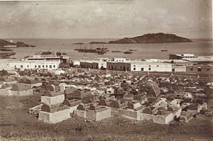 [2] نمایی از گورستان یهودیان عدن در کنار بندر قدیمی شهر، که در قرن نوزدهم و نیمه نخست قرن بیستم محل دفن اعضای جامعه یهودی پررونق این بندر بود. سنگقبرهای آن با کتیبههای عبری، عربی یا انگلیسی، گواهی بر حضور و نقش اقتصادی–فرهنگی یهودیان در تاریخ عدن بهشمار میآیند[۴۳].